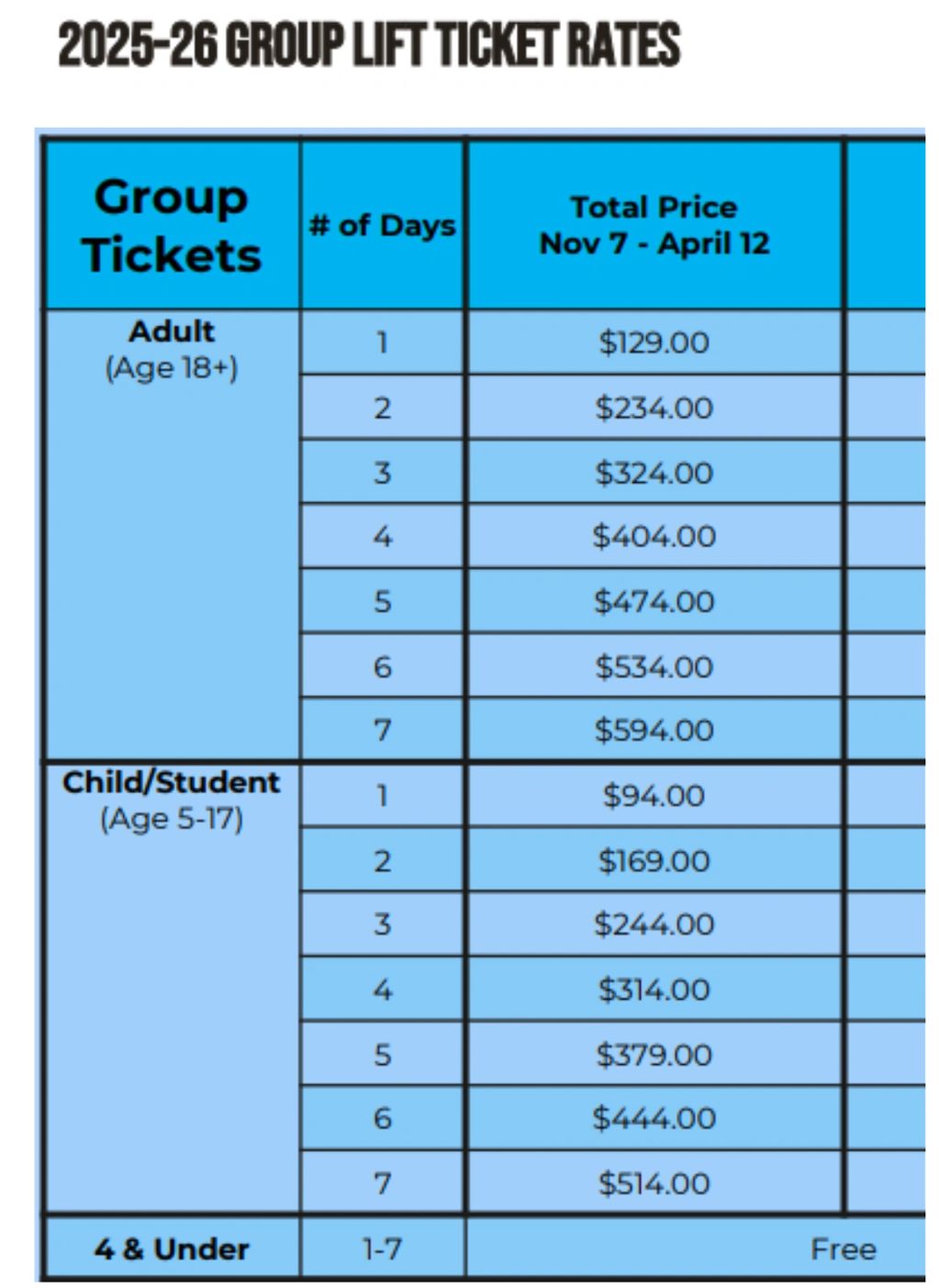 Age 4 & Under FREE.